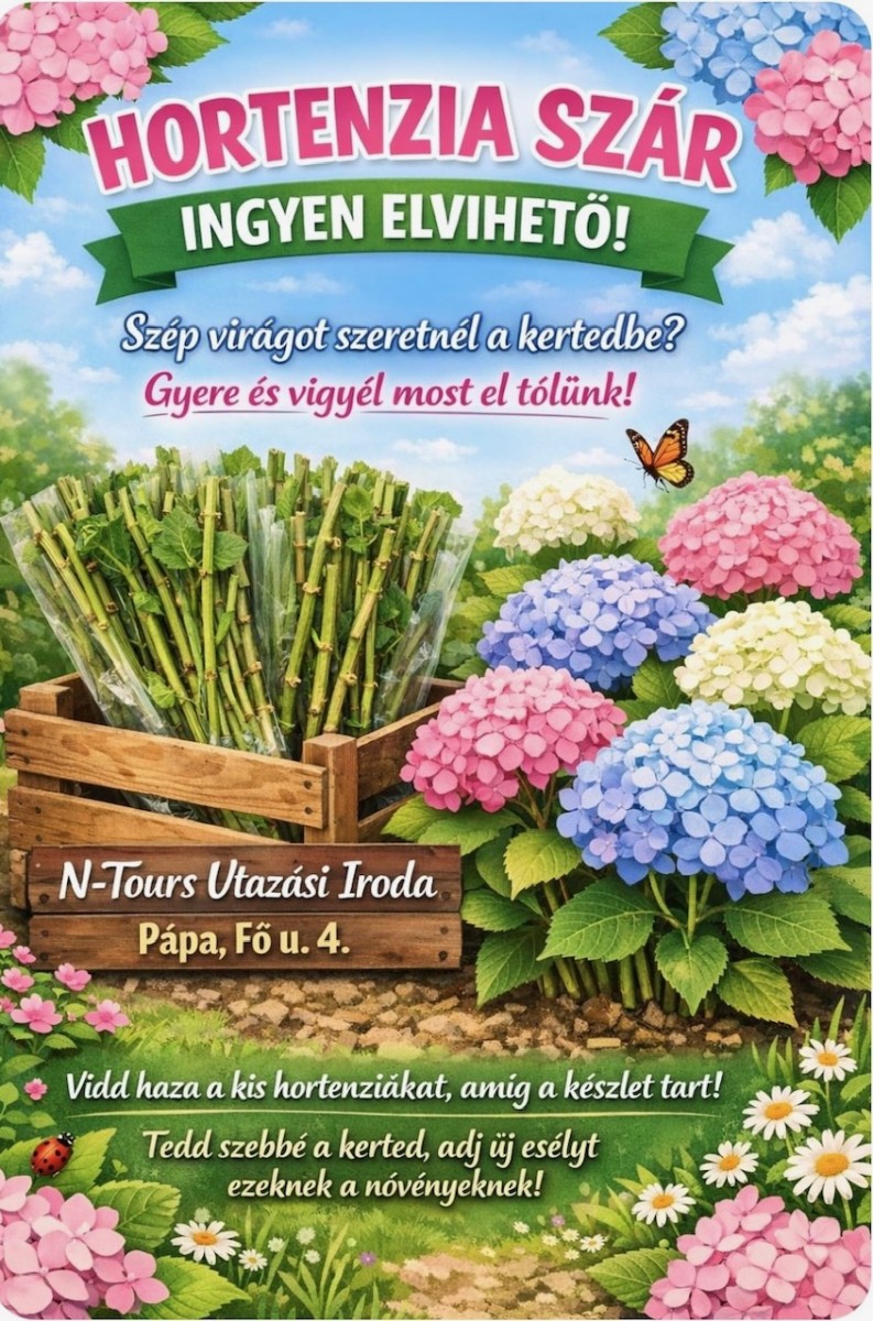 Aki lemaradt az ingyenes osztásról, annak még van lehetősége hortenzia dugványhoz jutni: a megmaradt vesszők átvehetők a N-Tours Utazási Iroda irodájában, nyitvatartási időben. A kezdeményezés célja, hogy minél több kertbe kerüljenek ezek a népszerű, dús virágzatú növények. A már előkészített dugványokat otthon elegendő földbe szúrni, és megfelelő gondozás mellett hamar megerednek.