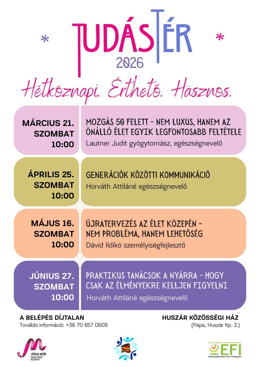 A TudásTér havonta egyszer, szombati napokon várja az érdeklődőket a Huszár Közösségi Házban. A szervezők bíznak benne, hogy a programsorozat hamar a helyi közösségi élet meghatározó eseményévé válik, és egy olyan fórumot teremt, ahol a tudás valóban közkinccsé válik. Az első alkalom szombaton, március 21-én 10 órakor lesz, a téma a mozgás 50 felett.