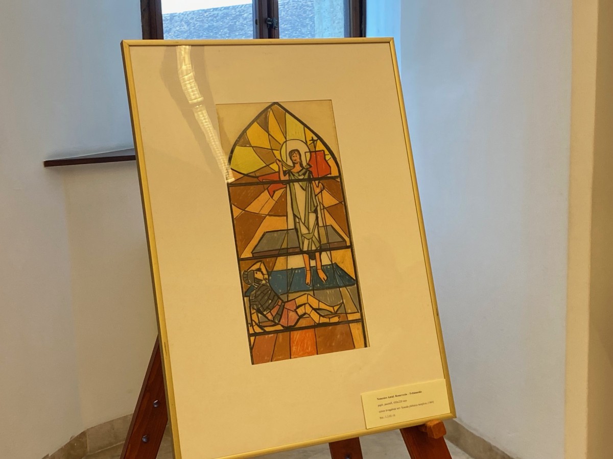 Németh Katalin műtárgyvédelmi asszisztens a Nógrád vármegyei Szanda település Szent Márton Plébániatemplom számára készült üvegablak tervét választotta a hónap műtárgyául. Mint mondta, a hagyományos ólomkeretes technikától eltérően egy vízszintes acélszerkezetre helyezett homokfúvott üveglapot alkalmazott Nemcsics Antal. A formára vágott üvegelemeket műgyantával színezte és rögzítette, a köztes réseket pedig fekete mangánbetonnal töltötte ki. Ez a hálószerű struktúra nemcsak szerkezeti, hanem kompozíciós szerepet is betöltött: dinamikusan vezette a tekintetet, és segítette a figurák térbe helyezését.