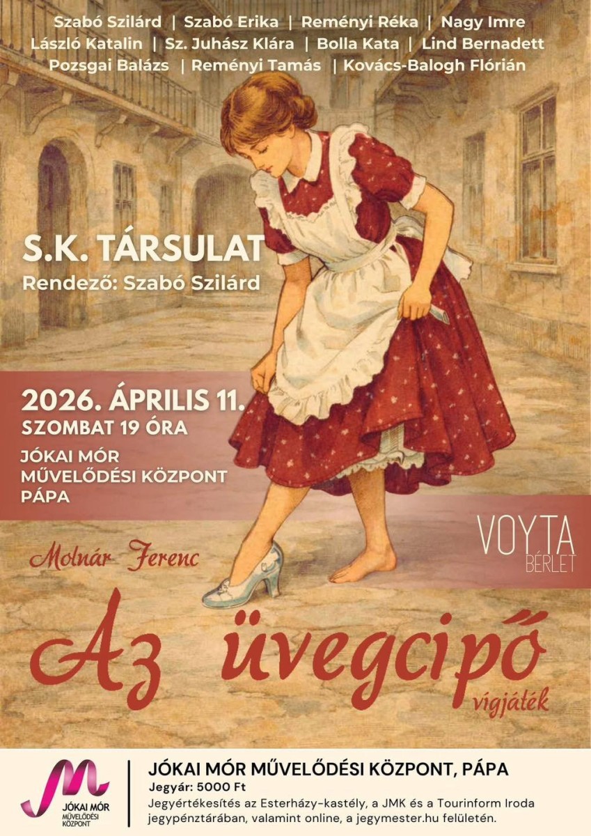 A szerelem, az álmok és a finom humor világa kel életre az S.K. Társulat előadásában, amely Molnár Ferenc „Az üvegcipő” című klasszikusát hozza el a közönség számára. A darab az 1920-as évek Budapestjére repíti vissza a nézőket, és egy álmodozó cselédlány sorsán keresztül mesél a reményről és a kitartásról.